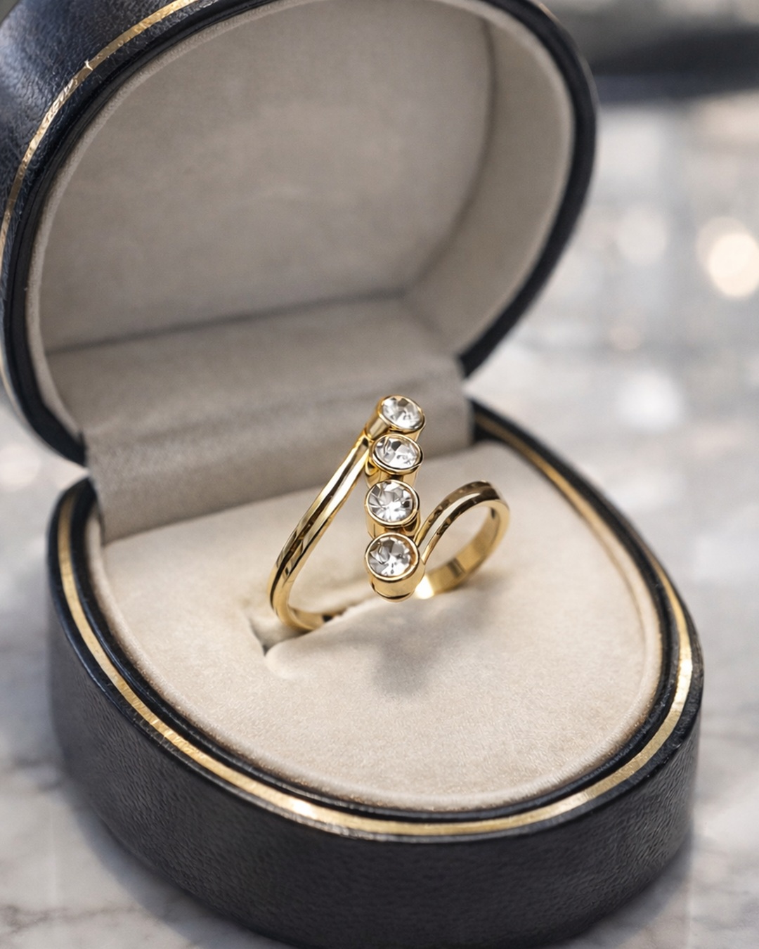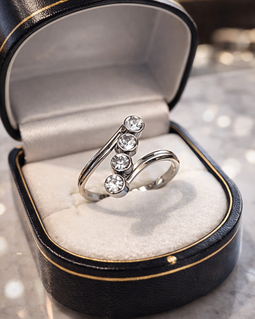 Elegantni prsten sa kristalima od nerđajućeg čelika. Moderan, izdržljiv i savršen za svakodnevno nošenje.
