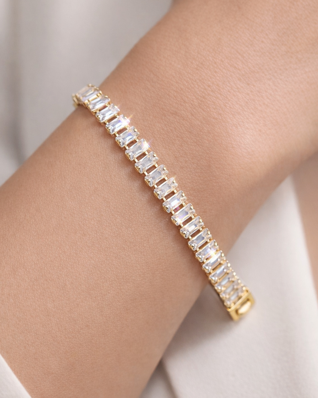 Narukvica sa kristalima u zlatnoj boji je elegantna i moderna, izrađena od visokokvalitetnih materijala. Ima inovativan dizajn s sofisticiranim detaljima, za sve prilike i praktičnu kopču.