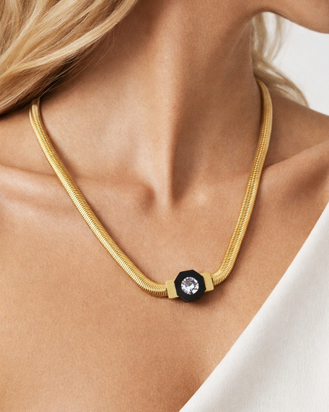 Zmija ogrlica sa priveskom cirkona za svakodnevno nošenje, kao i posebne prilike. Izrađen je od kvalitetnog materijala, koji je otporan na kvašenje i habanje.